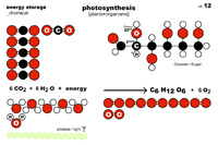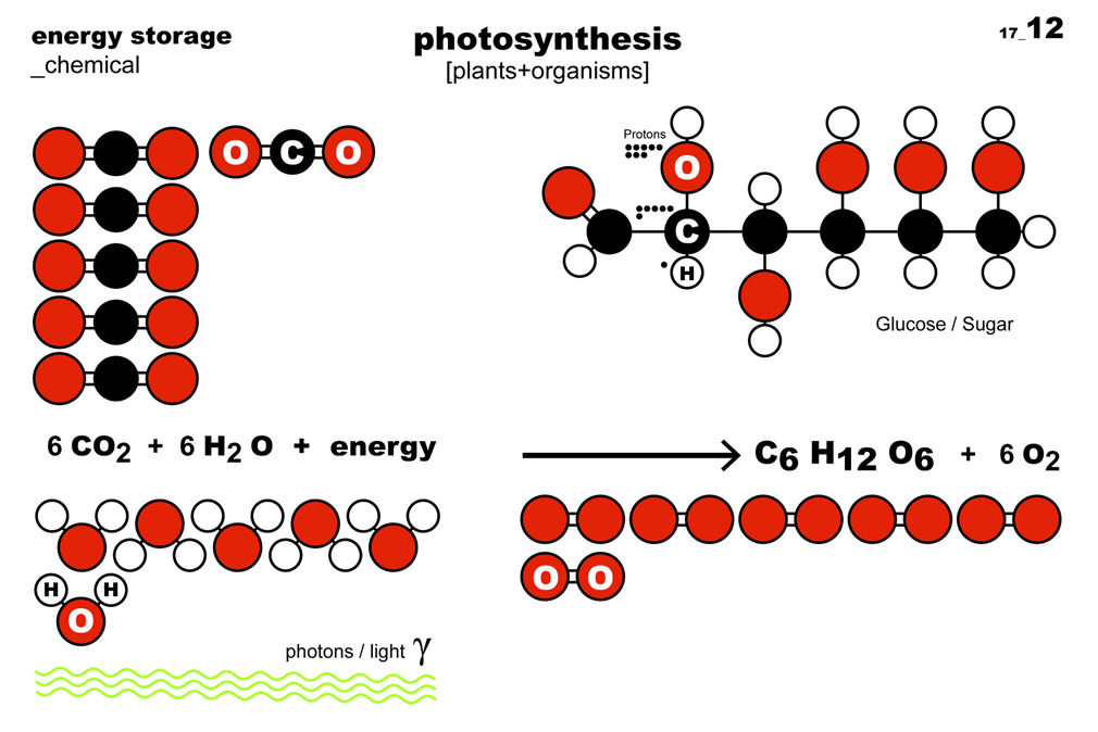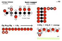 C6 H12 O6 [glucose] + 6 O2 ––> 6 CO2 + 6 H2O + energy / photons [~ 38 ATP]