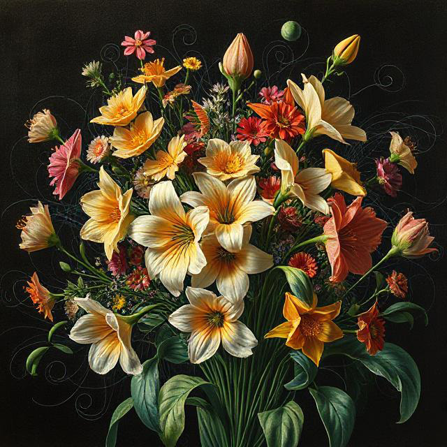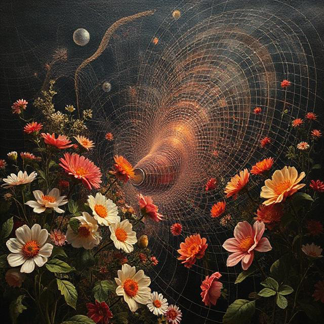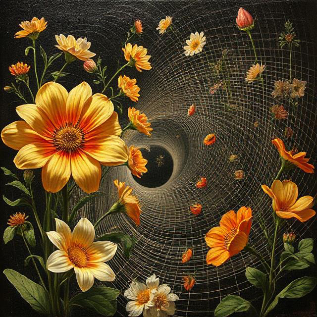 optic, magic, Von Eyck style, old masters, optics, waves, lenses, Vermeer, oil painting, maths, perspective, techniques, no persons, flowers, , computer amazing radio waves bouquet, arabic, escher