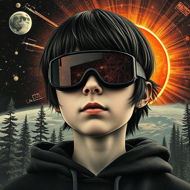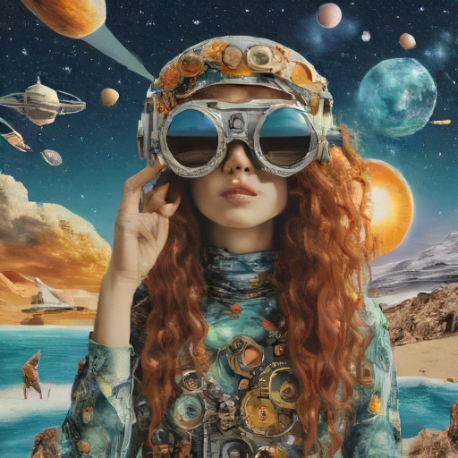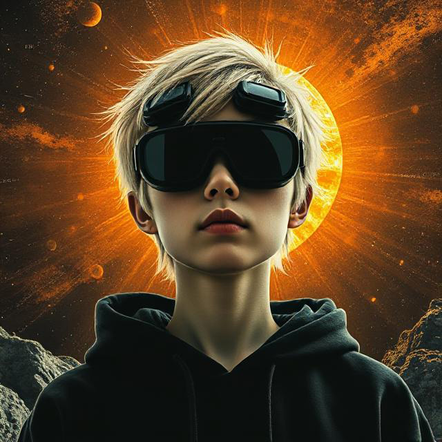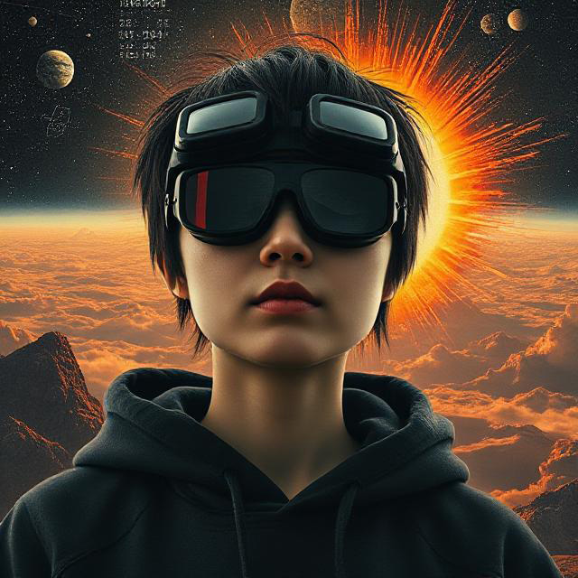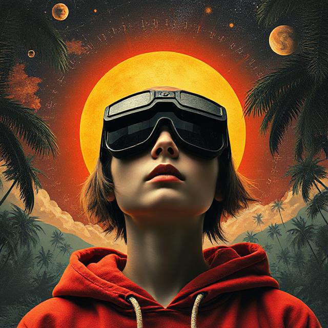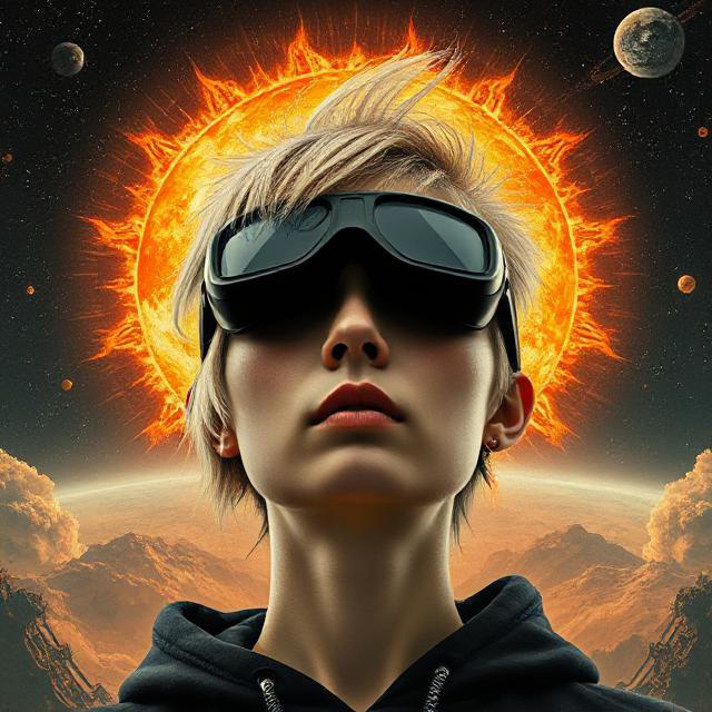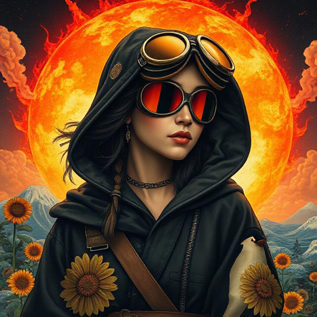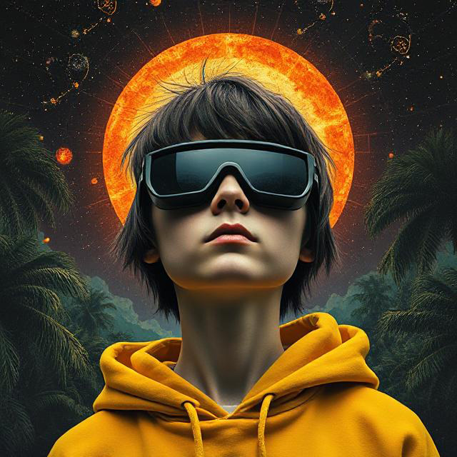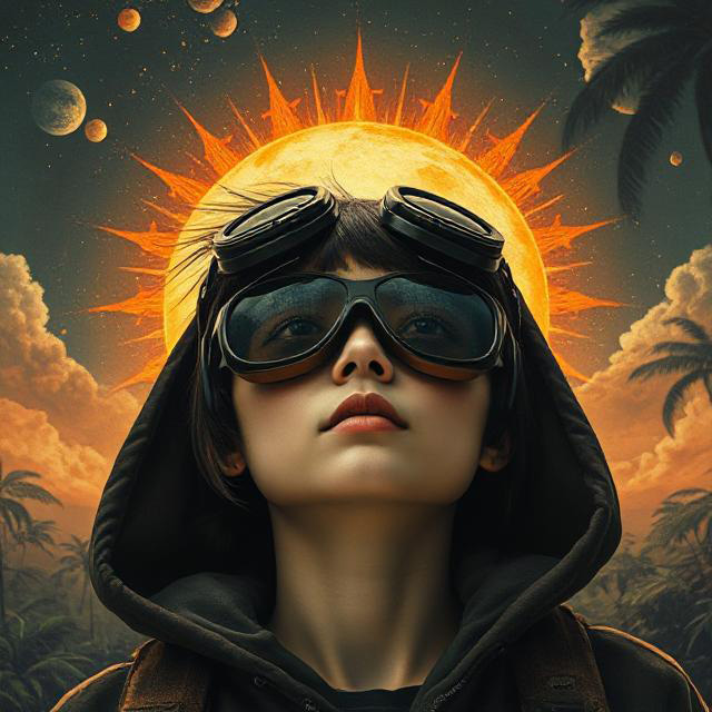 icon, goggles, southpole, vermeer, math, physics, collage, pattern, fotorealistic sun, collage, levels, space, time, in style, collage, levels, nasa sun, modern the future, happy portrait, girl, jungle, sun in backgrounnd, short shaggy hair, hoodie, looking up from front