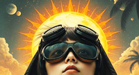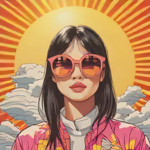 the future - sun is so bright you have got to wear shades, bright funcky cool chinese girl, big drawn sun in background