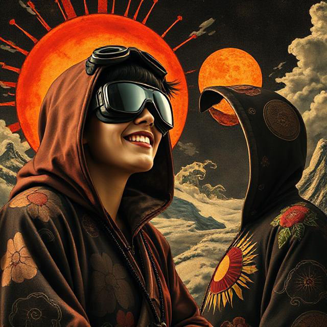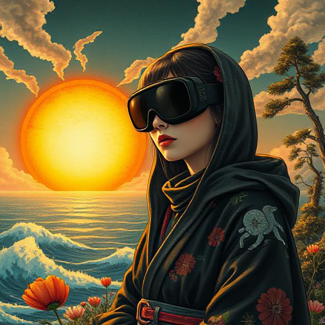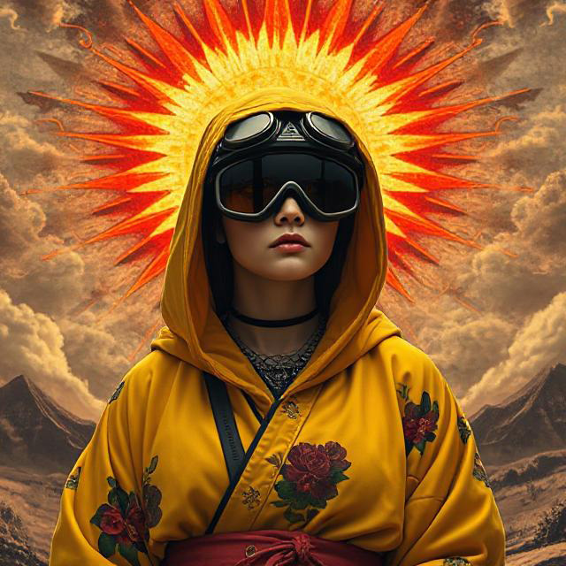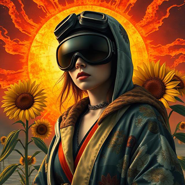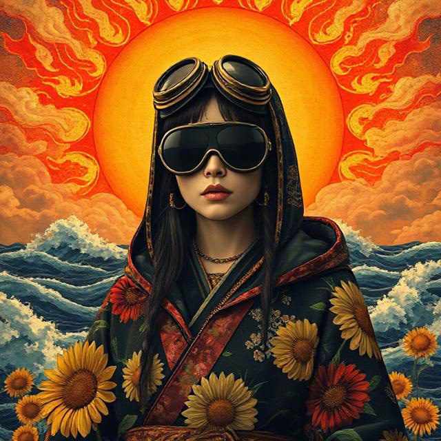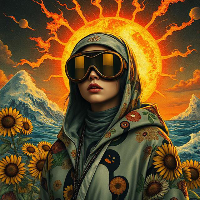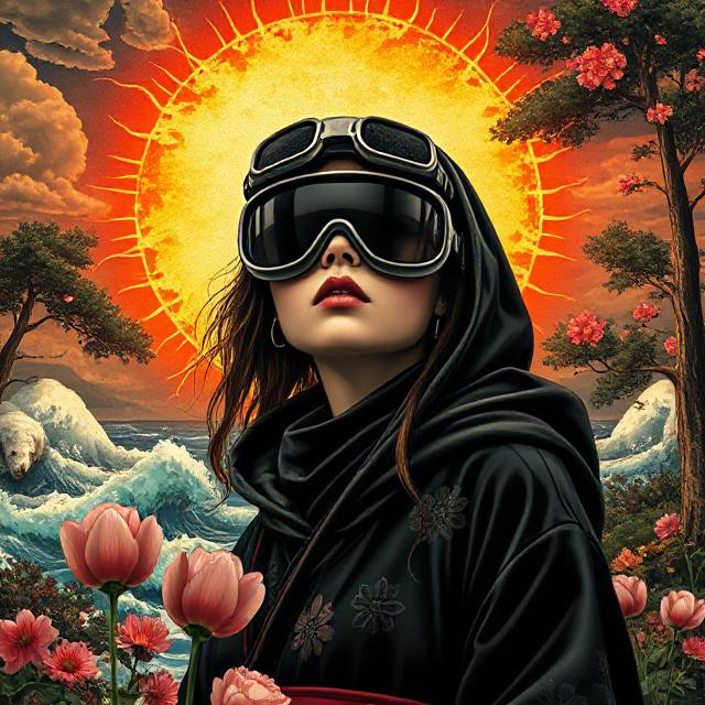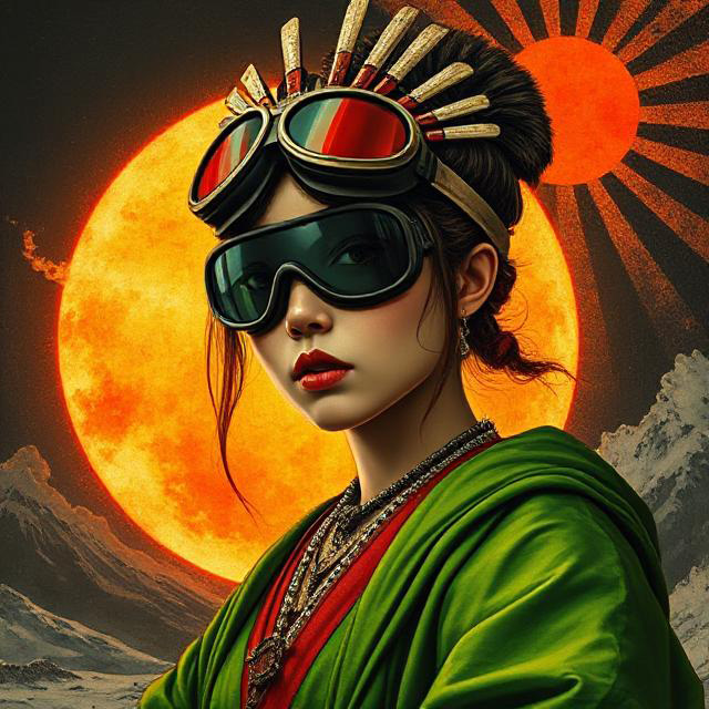 punk style, van Eyck style, asian woman, davinci in japan, burning nasa fotorealistic exploding sun background, dark big goggles and japanese crest, looking up, symetric, centered, northpole and background, bright green robe, manga, background, huge dark big mirrored goggles, fake ocean background, flowered drumstickflowert, cherryblossom