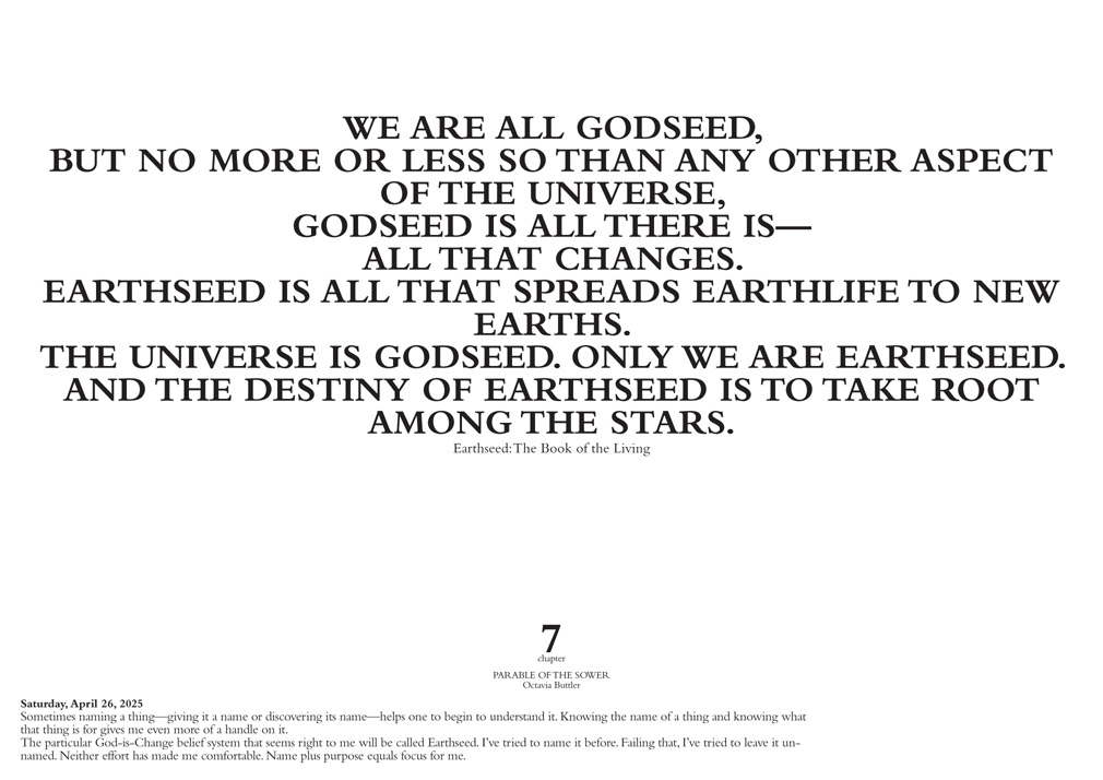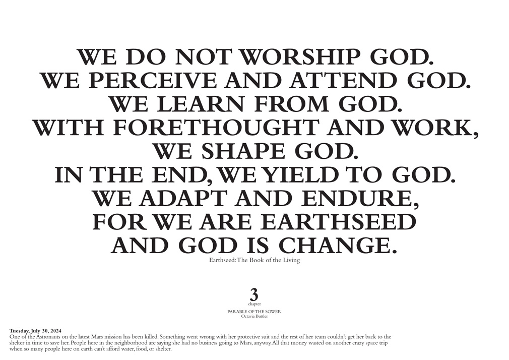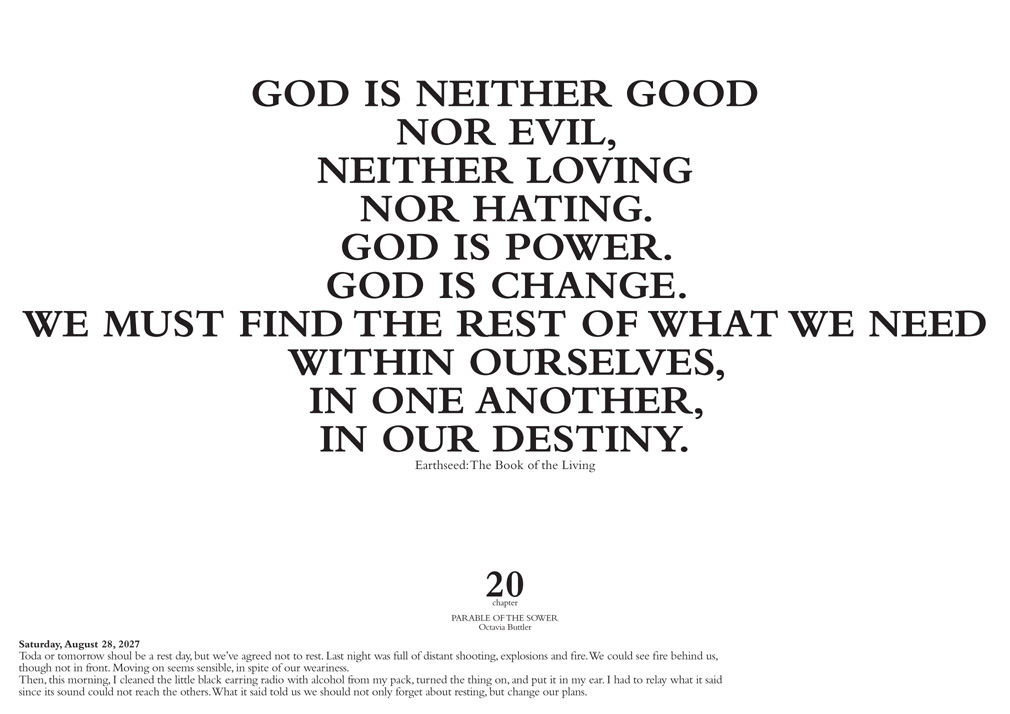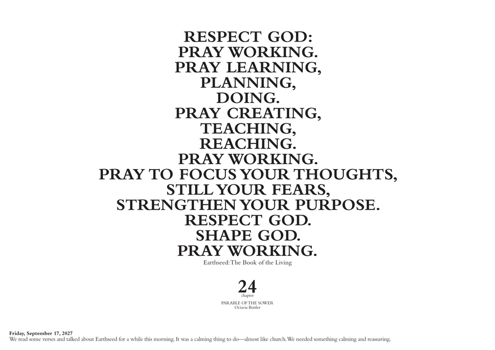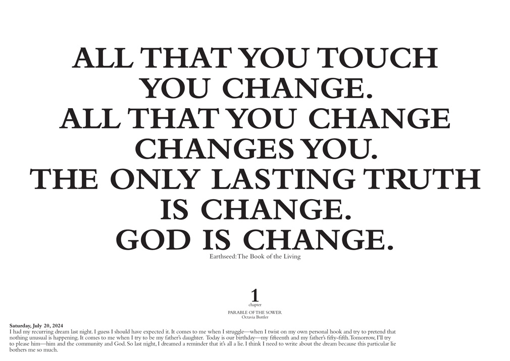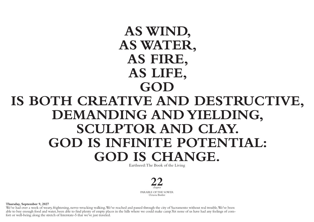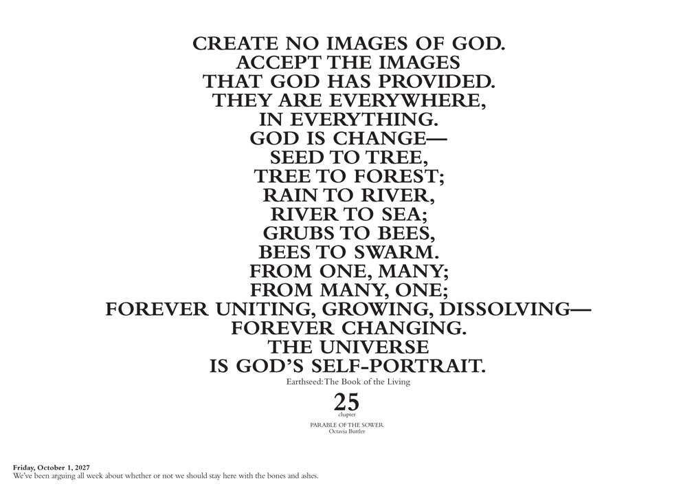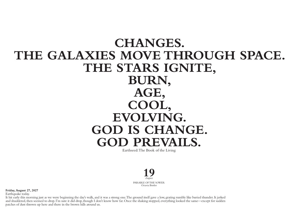 *Central to the novel is Lauren Olamina’s religion, Earthseed, which is based on the idea that “God is Change.”