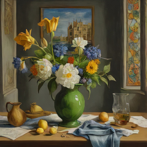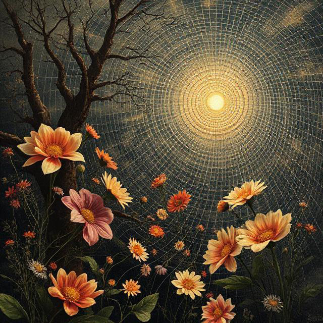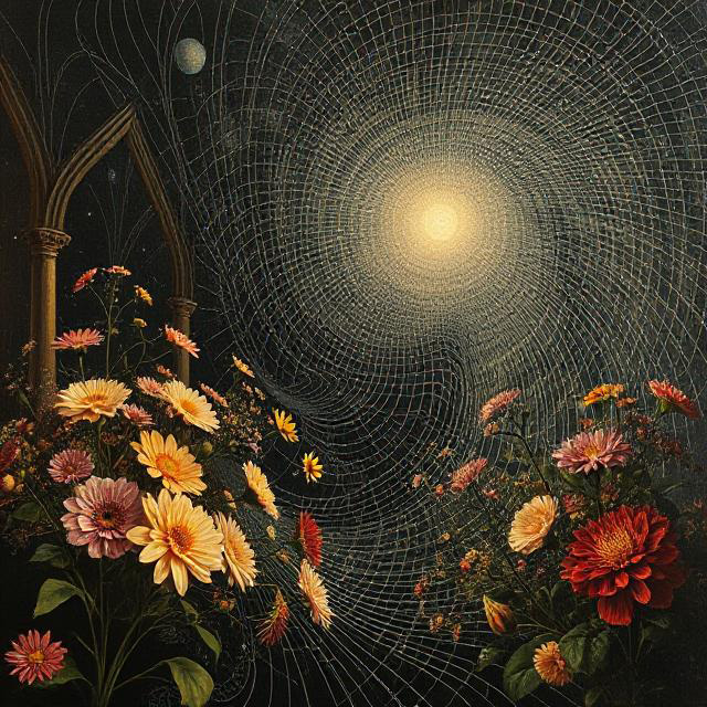 optic, magic, Von Eyck style, old masters, optics, waves, lenses, Vermeer, oil painting, maths, perspective, techniques, no persons, flowers, , computer amazing radio waves bouquet, arabic, escher