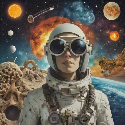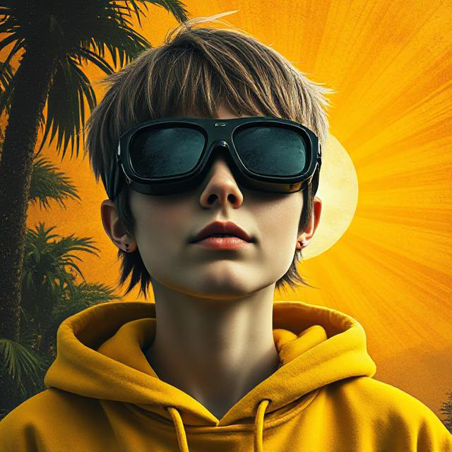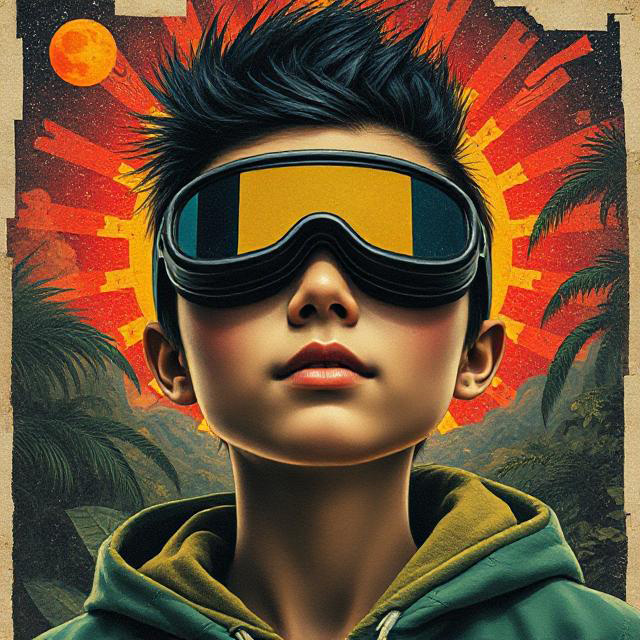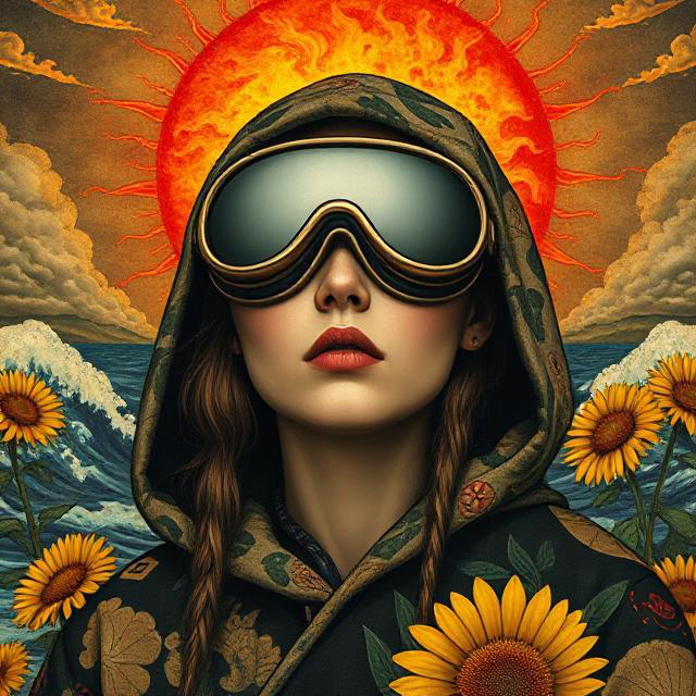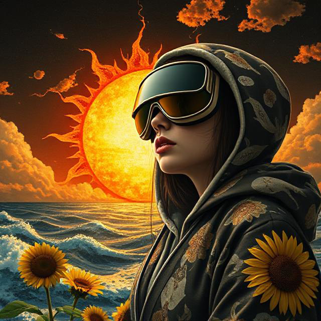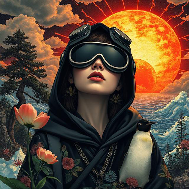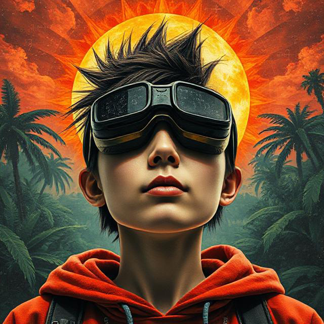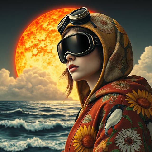icon, goggles, southpole, vermeer, math, physics, collage, pattern, fotorealistic sun, collage, levels, space, time, in style, collage, levels, nasa sun, modern the future, happy portrait, girl, jungle, sun in backgrounnd, short shaggy hair, hoodie, looking up from front