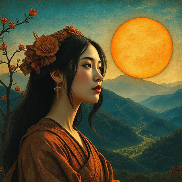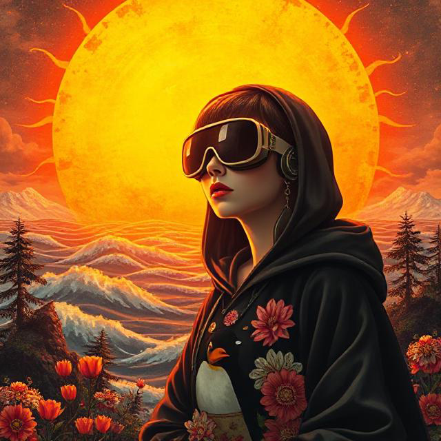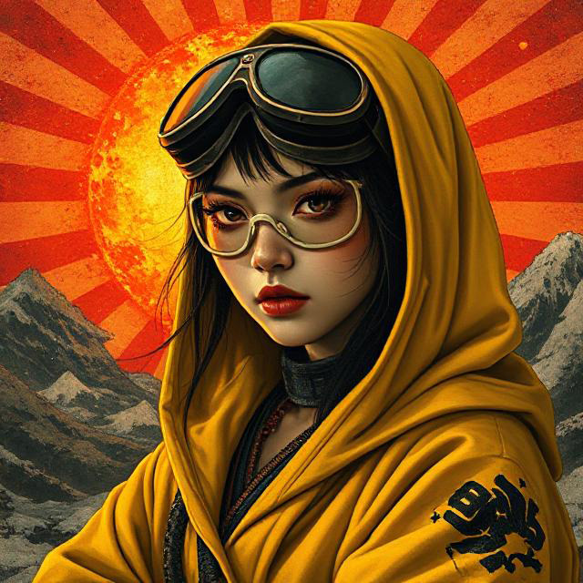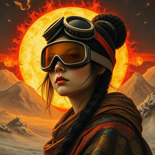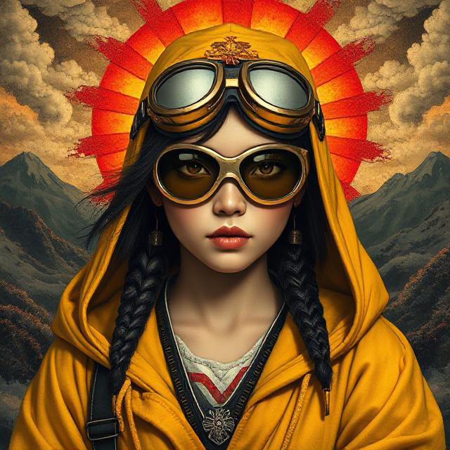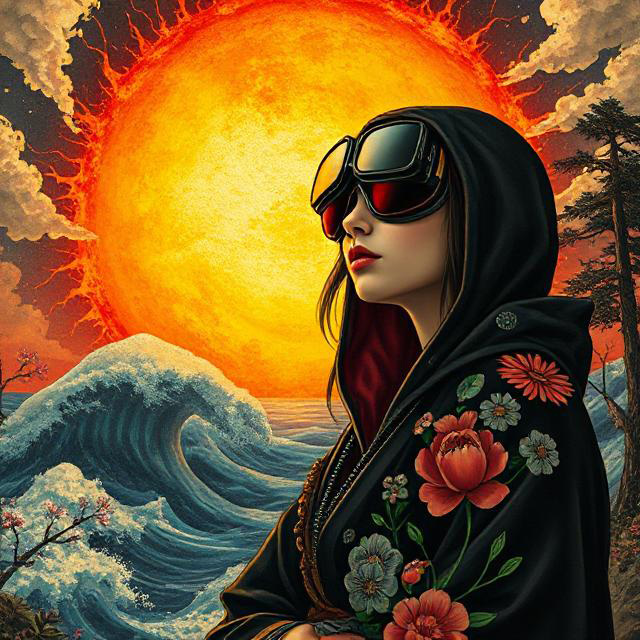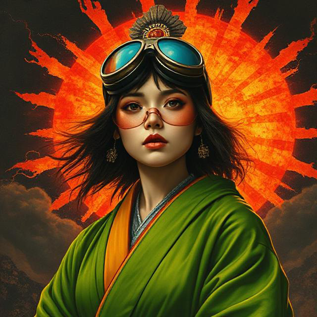 punk style, van Eyck style, asian woman, davinci in japan, burning nasa fotorealistic exploding sun background, dark big goggles and japanese crest, looking up, symetric, centered, northpole and background, bright green robe, manga, background, huge dark big mirrored goggles, fake ocean background, flowered drumstickflowert, cherryblossom